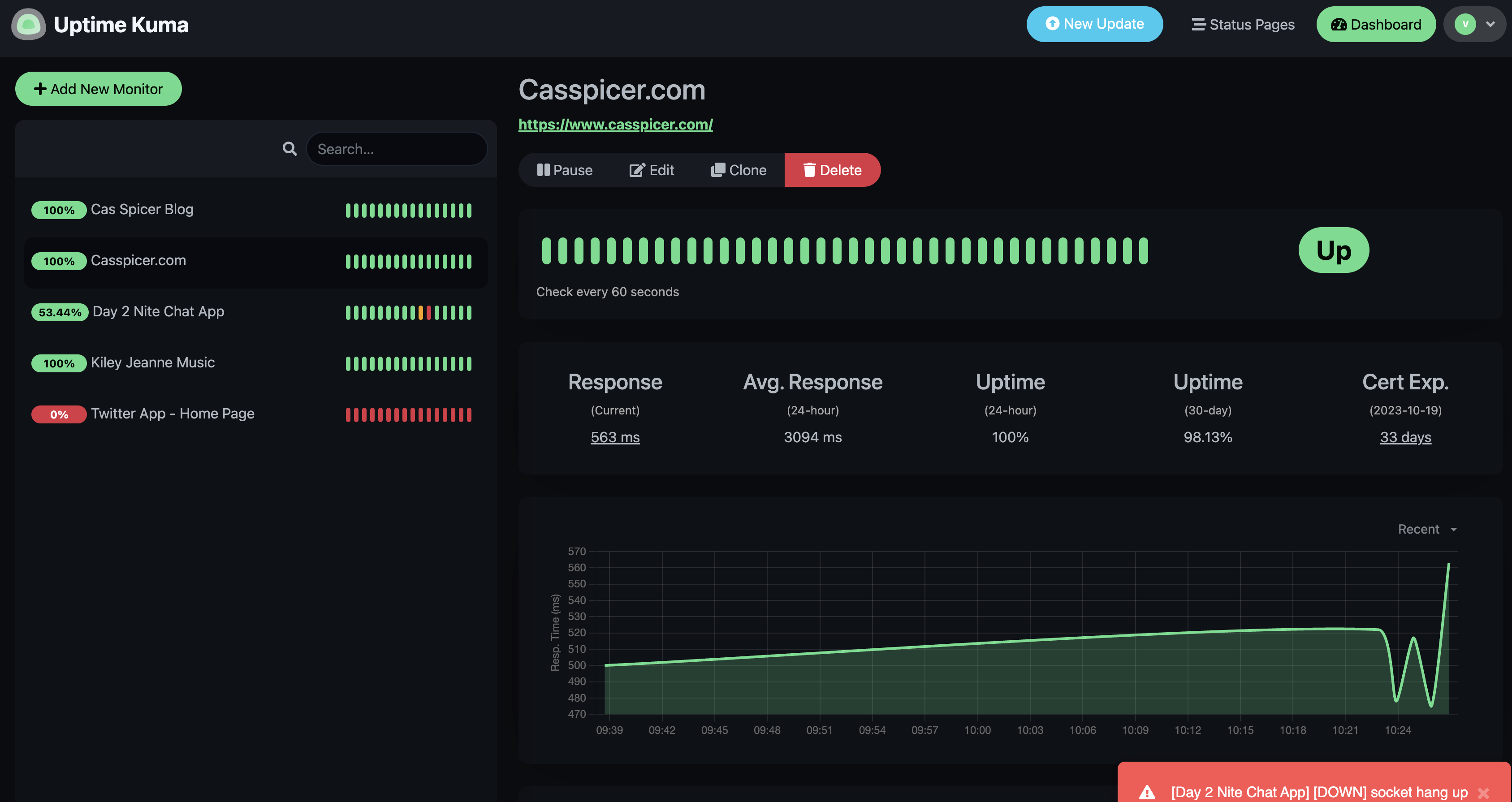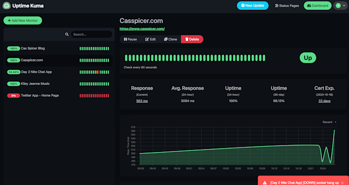 pic of UptimeKuma logs I figured out that this is an exception being thrown by the server, and found this article outlining possible reasons for a socket hang up error when using websockets in node.js and express.js.Right off the bat, I noticed that my server's source code - which I wrote back in the Spring of last year - is using http. This works fine for running the app locally in port 3000 during development. However, the production app is receiving requests for a https connection. *but then why wouldn't I see this exception all the time in the logs?